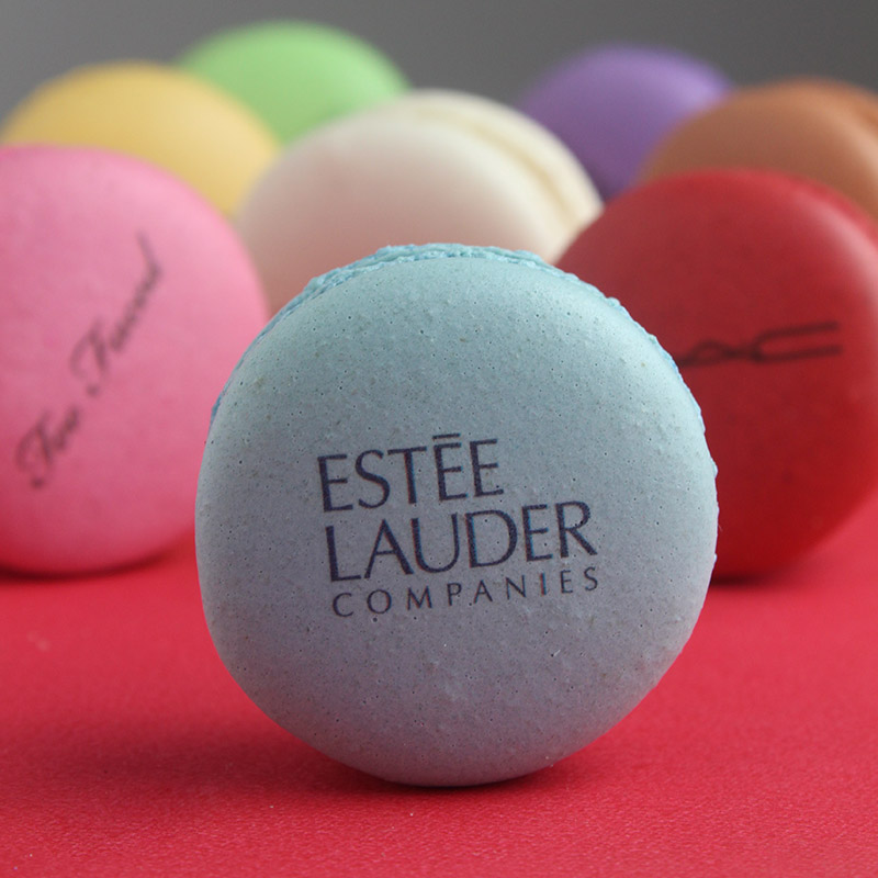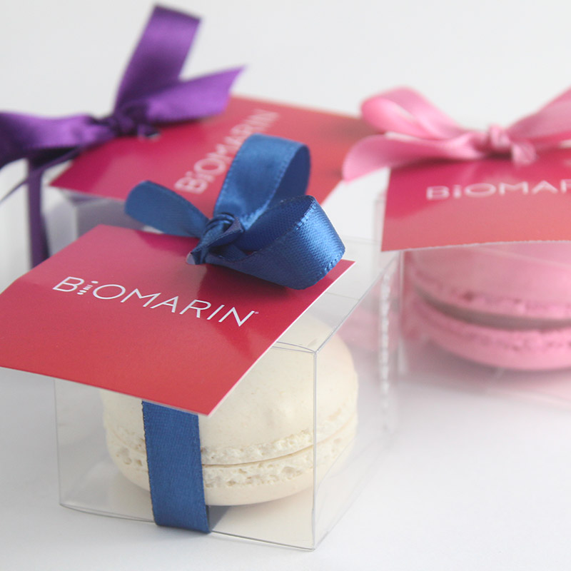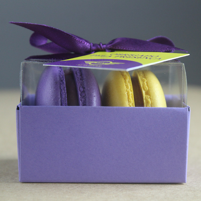 As caixas com um macarons são ótimas para convenções e feiras corporativas. Os macarons podem ter a cor da identidade visual da empresa, assim como a logomarca impressa no macaron.